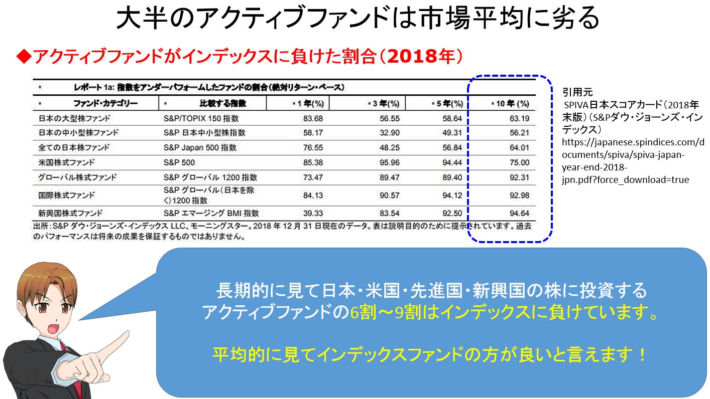 お金の学校 キリコ インデックス投資家 On Twitter この表を出すとアクティブ運用派の人からツッコミが入るんですが やっぱりファンドを選ぶならインデックスファンドが良いと思うんですよね 市場平均に勝つかどうか分からないファンドを当てにいくより 平均的に