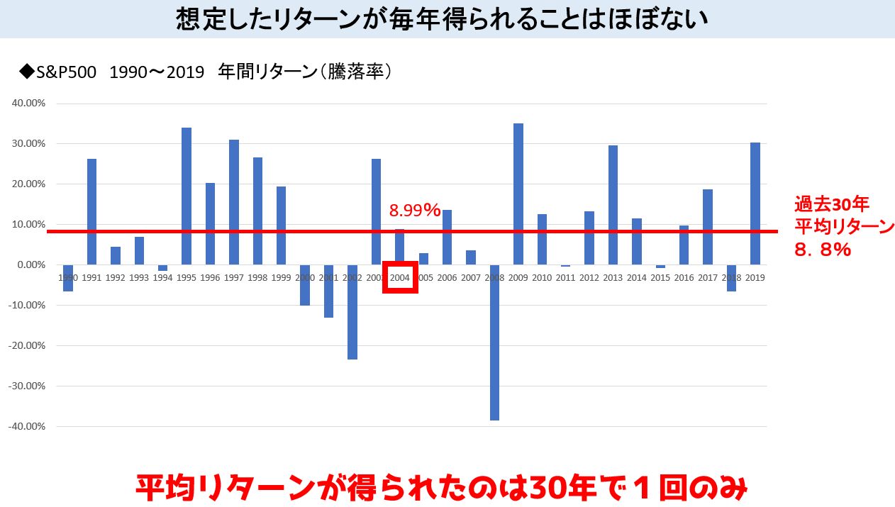 お金の学校 キリコ インデックス投資家 On Twitter S P500の過去30年の平均リターンは8 8 でも そのリターンが得られた年は30年でたったの1年 投資信託で利回り で増えるという計算は 本当に皮算用なので 大きく増える 大きく減ることも
